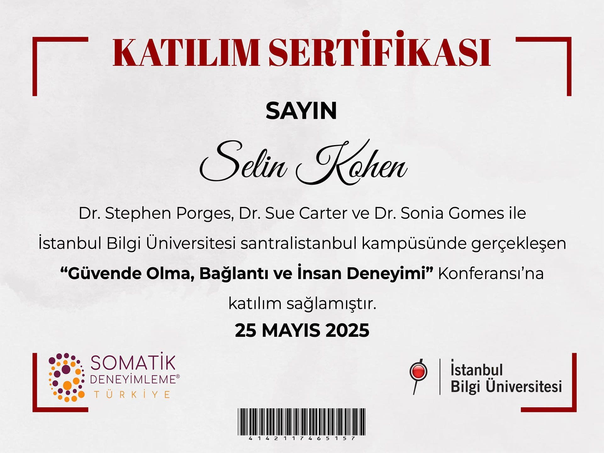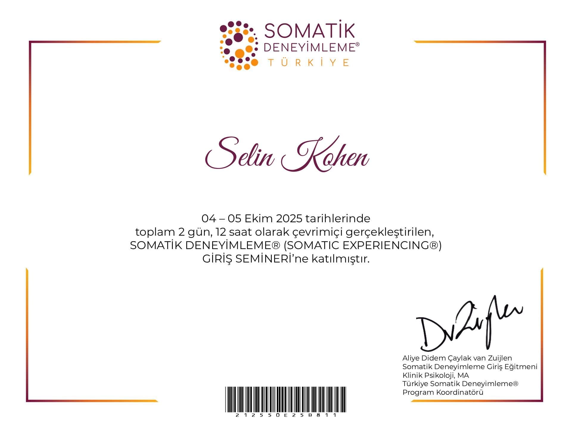 Hâlen, ABD Beden Psikoterapisi Derneği (SABP) onaylı sinir sistemi temelli üç yıl sürecek Neurosystemic Care eğitim programına devam etmektedir.